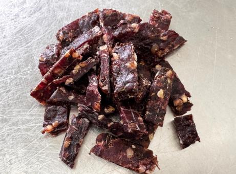 Verkehrsbezeichnung: Luftgetrocknete Fleischzubereitung aus Rindfleisch mit getrockneten Datteln und Mandeln.